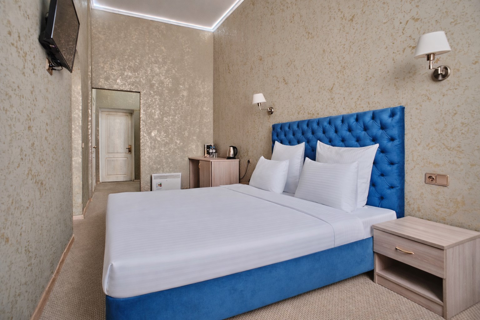 В номерах категории Эконом - одна односпальная кровать или одна двуспальная, чайный набор, бесплатный доступ в интернет, телевизор с плоским экраном и спутниковым телевидением, фен, кондиционер, холодильник, косметические принадлежности, тапочки