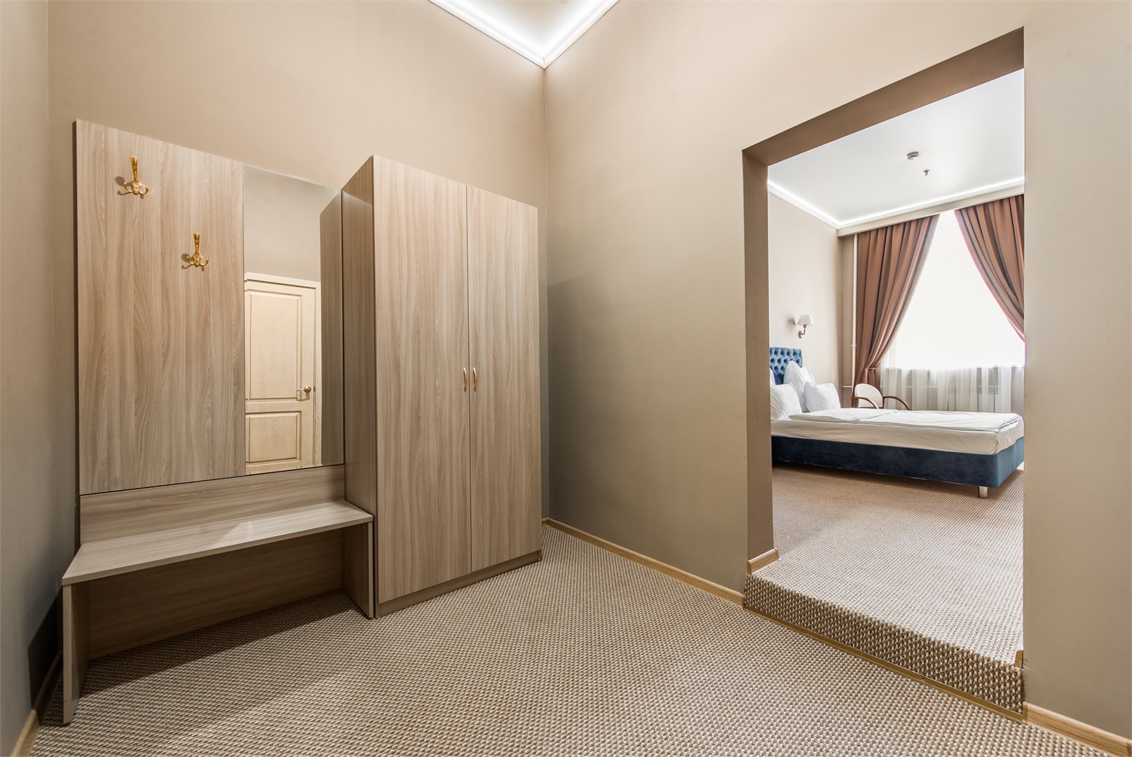 Номера категории Полулюкс –двухкомнатные номера с двуспальной кроватью и раскладным диваном, чайный набор, бесплатный доступ в интернет, телевизор с плоским экраном и спутниковым телевидением, фен, кондиционер, холодильник, расширенный ассортимент косметических принадлежностей, тапочки